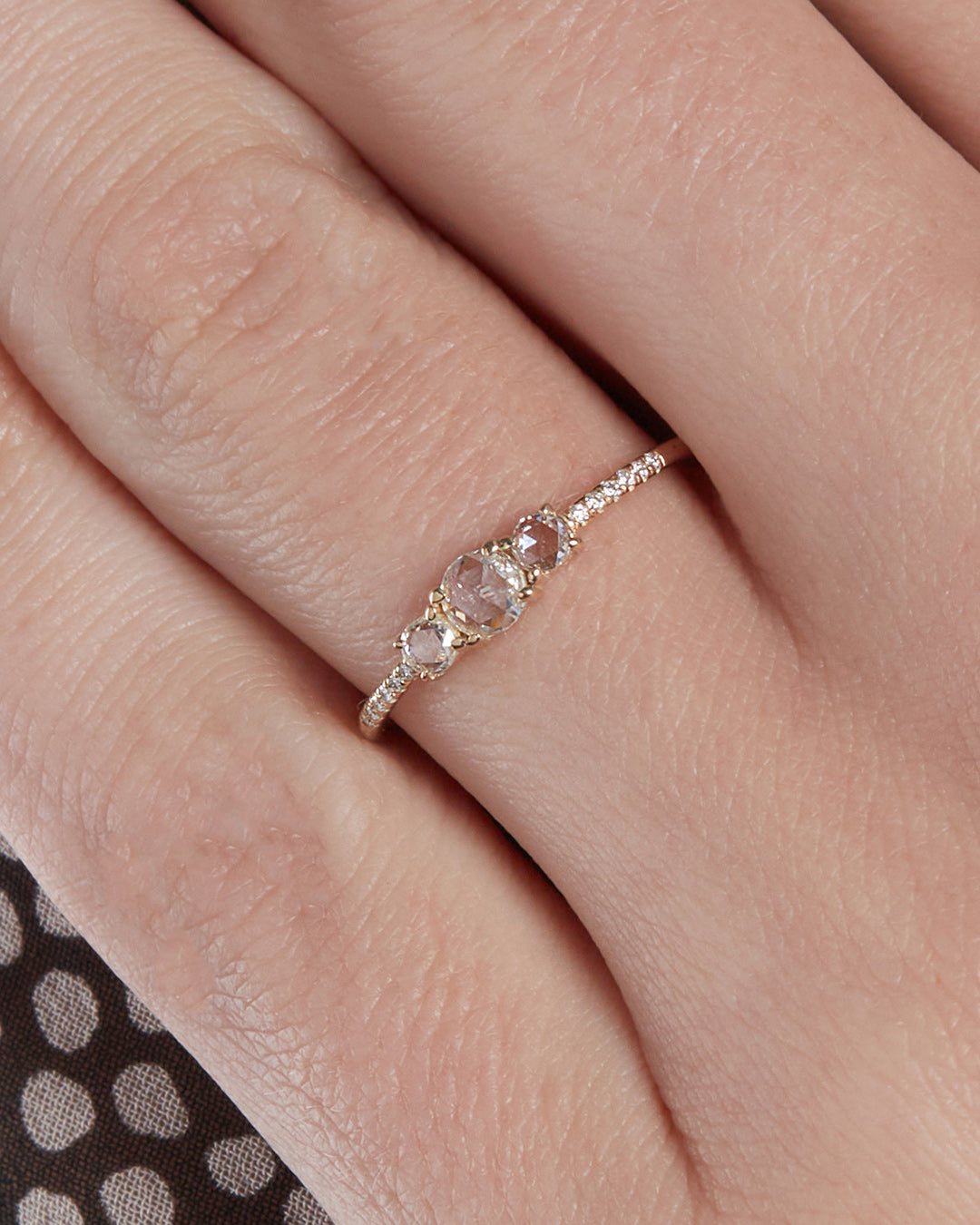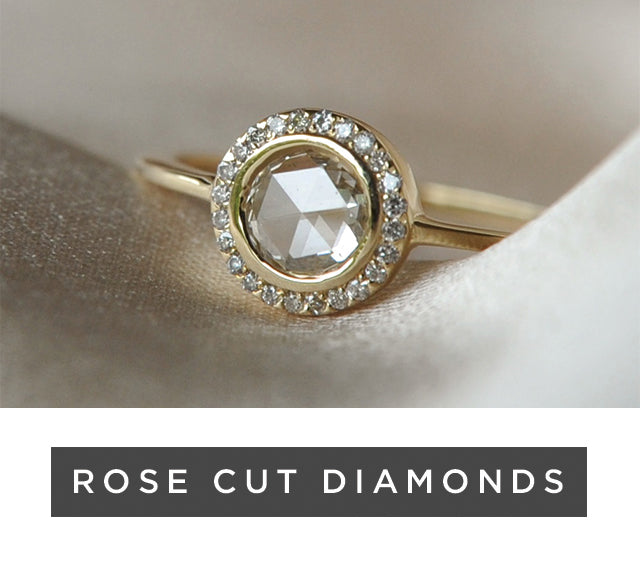 Another bonus of buying a rose cut is since it's flat on the bottom, the stones size appears much larger than its actual carat weight. For example, a 6mm round diamond would be around 0.9 carat in a modern round brilliant cut (a traditional diamond) and around 0.42 carat in a rose cut. They look the same from the top view since they are the same width, but the lack of the base of the rose cut makes it lighter so you end up paying less since it’s a lower carat weight.
