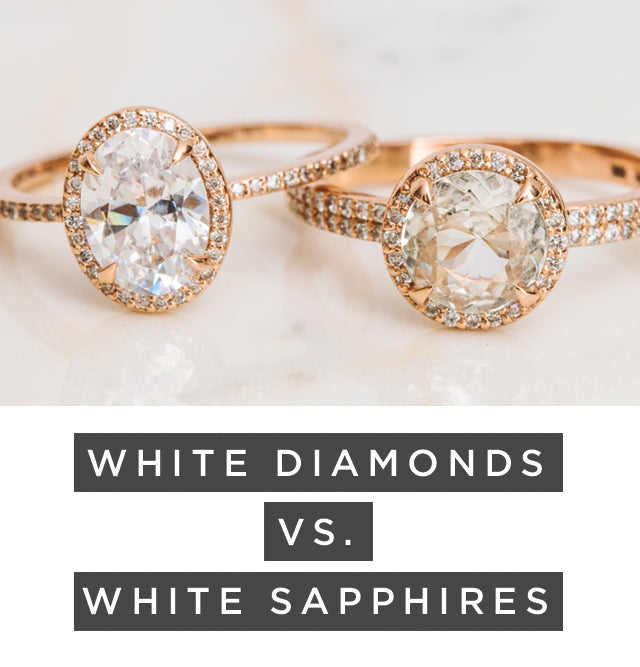 A white diamond will sparkle more than than a white sapphire. Diamonds has more scintillation, which refers to the rainbow colors that you can typically see a diamond giving off. A white sapphire does not display any scintillation. However, white sapphires still sparkle in their own right. See the image above to reference the two side by side: the oval-cut white diamond is on the LEFT and the round-cut white sapphire is on the RIGHT.